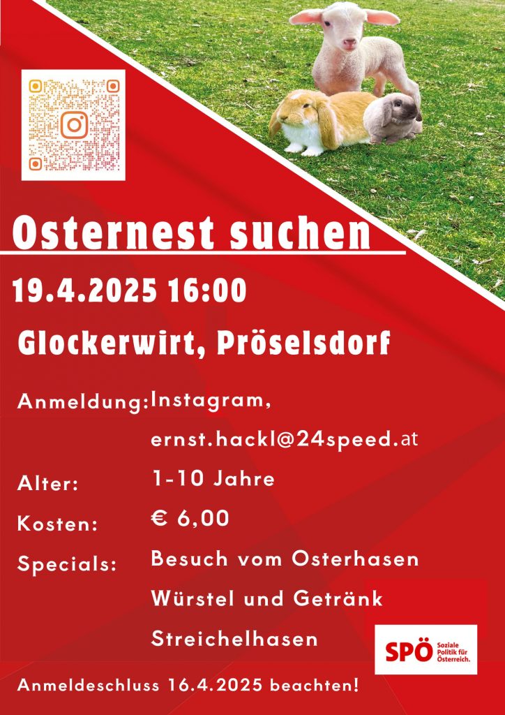 Am Samstag, den 19. April 2025, um 16:00 Uhr geht es beim GH Glockerwirt in Pröselsdorf auf die Suche nach den versteckten Nestern. Eintritt: € 6,00 pro Kind.